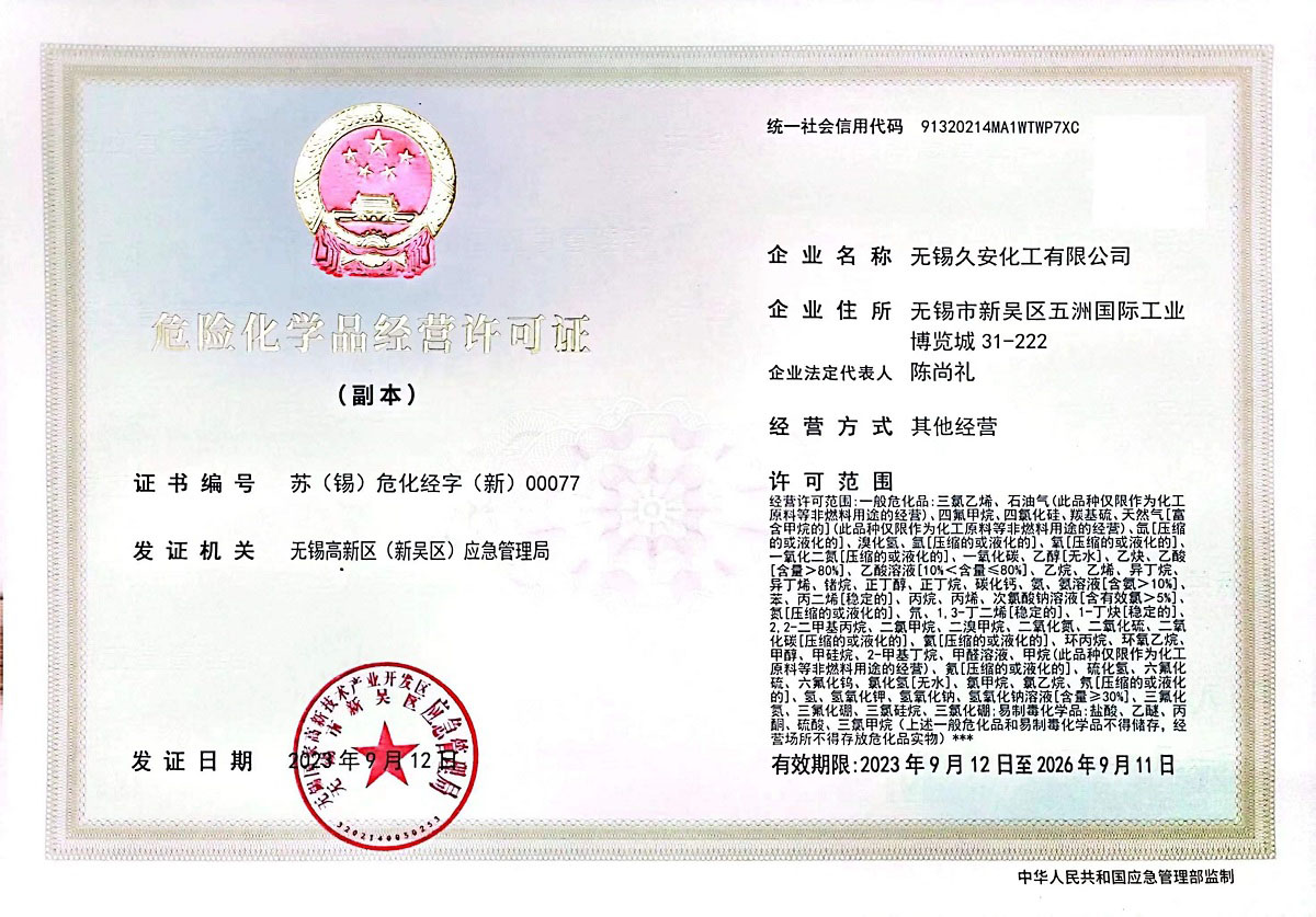 无锡久安化工有限公司成立于2018年,位于无锡锡山区是一家专业的工业气体供应商,无锡久安化工生产与销售各种气体、工业气体高纯度气体、特种气体体、电子气体、稀有气体等多种产品:氧气、氮气、氩气、二氧化碳、混合气等工业气体;液氧、液氮、液氩、液二氧化碳、等液态气体;乙炔、丙烷、氢气、高纯气、特气等特殊气体等。